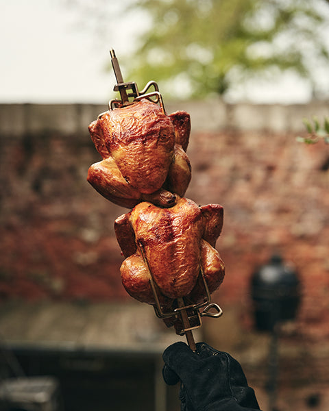 Scopri il forno girarrosto BSTRD., progettato per offrire una cottura impeccabile sia per la pizza che per gli arrosti. Un accessorio versatile che trasforma il tuo Kamado in una macchina da cucina completa, capace di preparare pizze croccanti e arrosti succulenti con facilità.