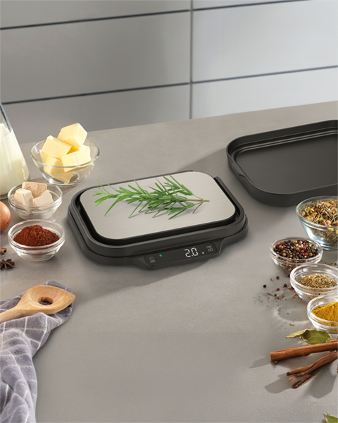 Realizzata in acciaio inox anti-impronta, la bilancia KitchenDuo si distingue per il suo stile moderno e professionale. Con dimensioni contenute (24 x 4 x 20 cm), si adatta perfettamente a qualsiasi cucina, occupando pochissimo spazio e offrendo una superficie facile da pulire.