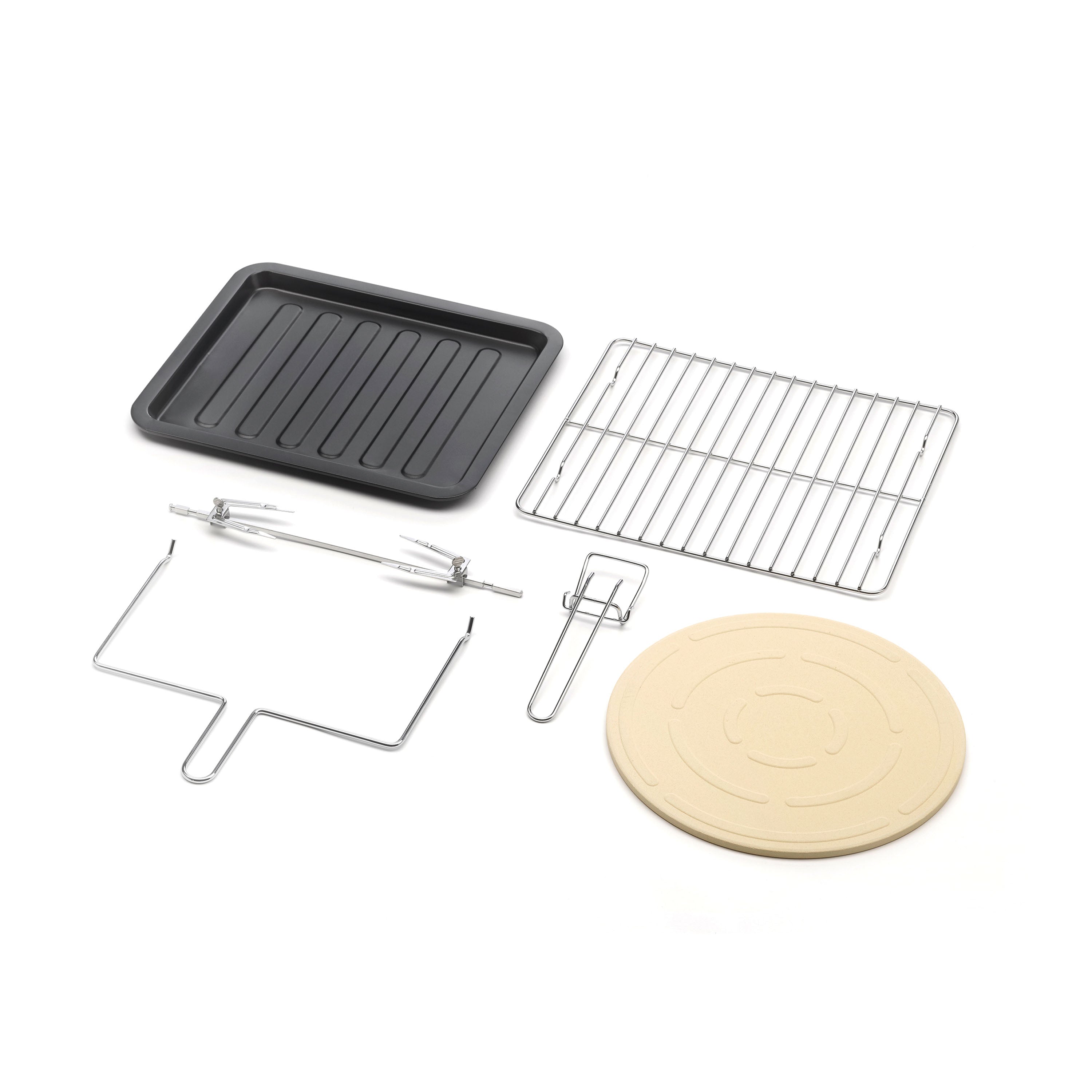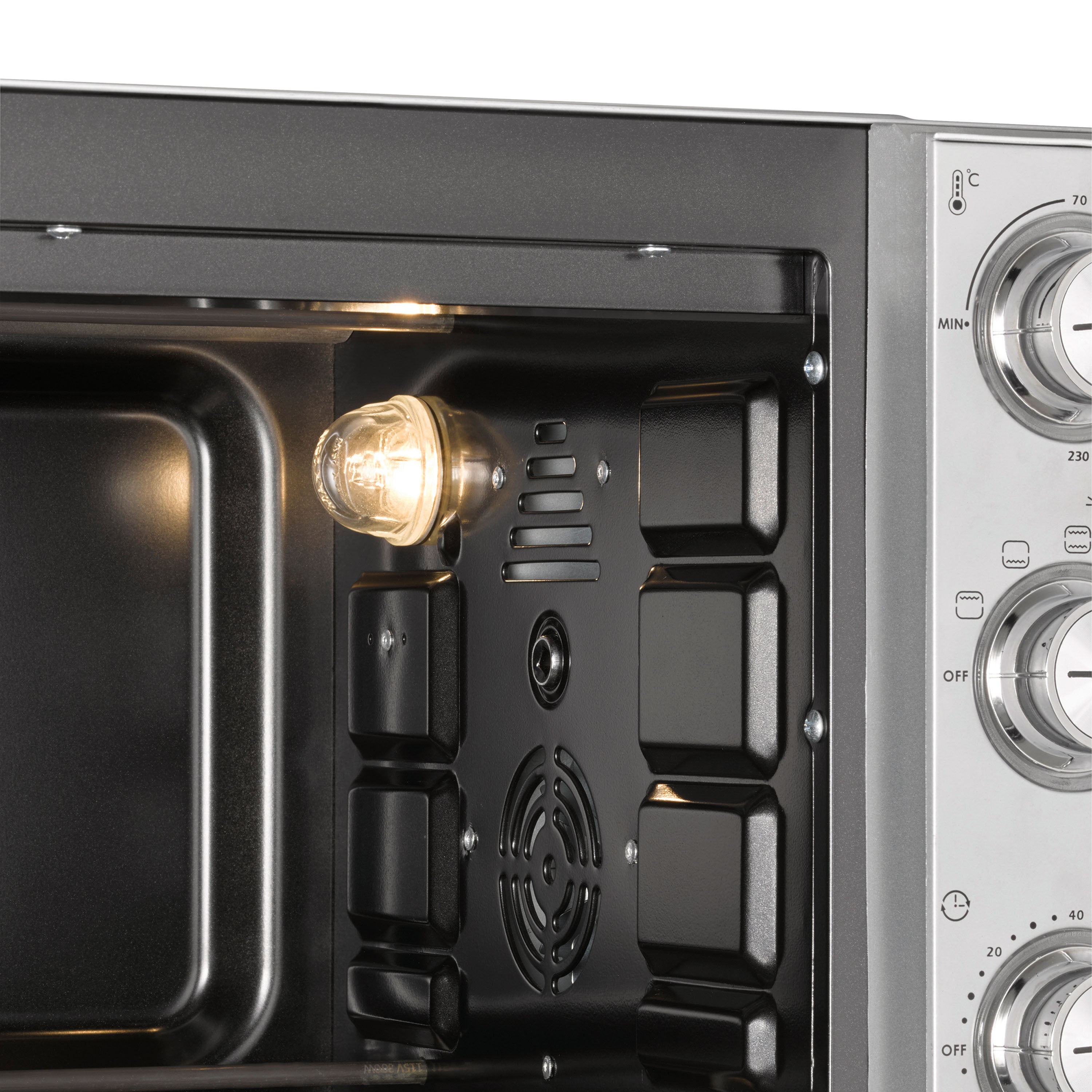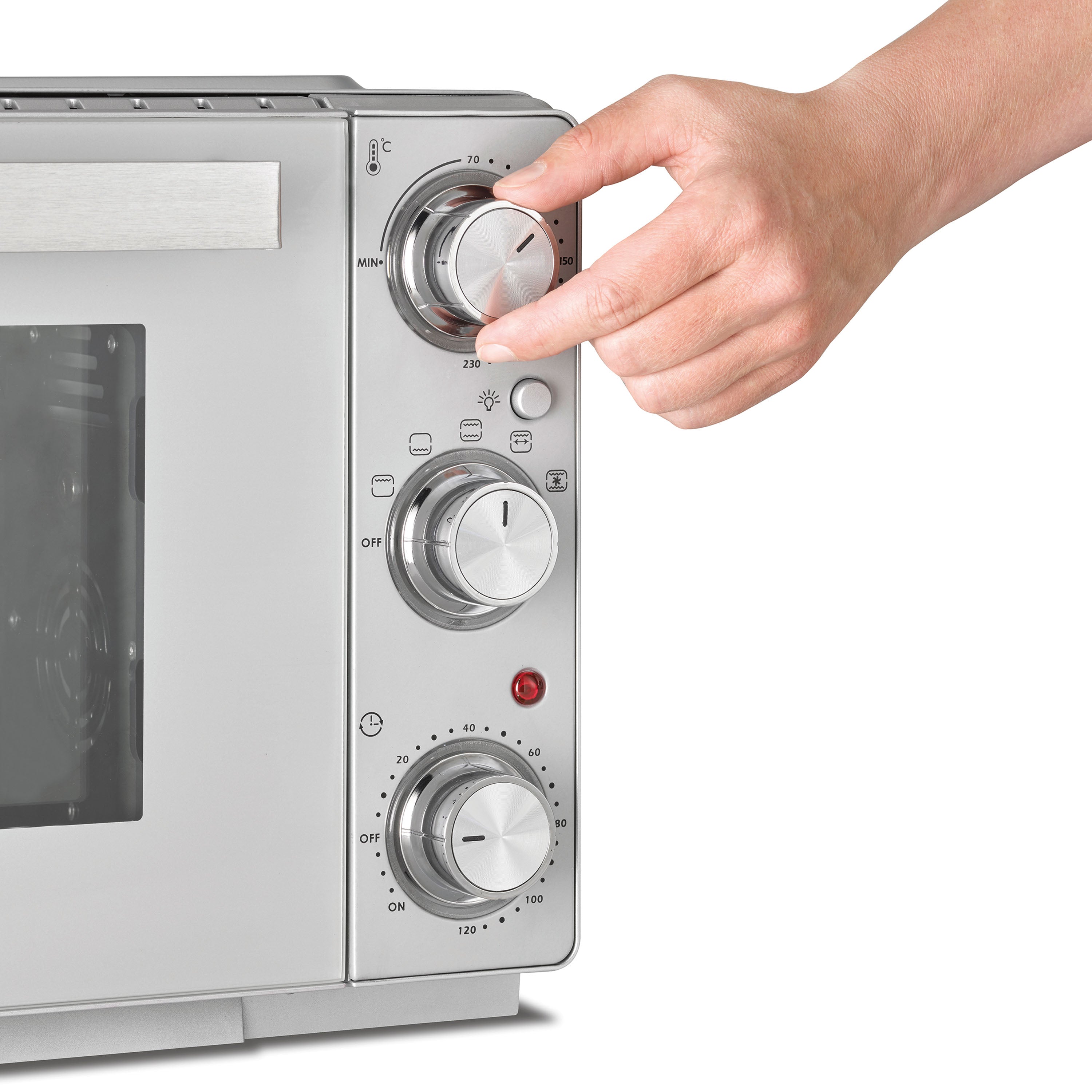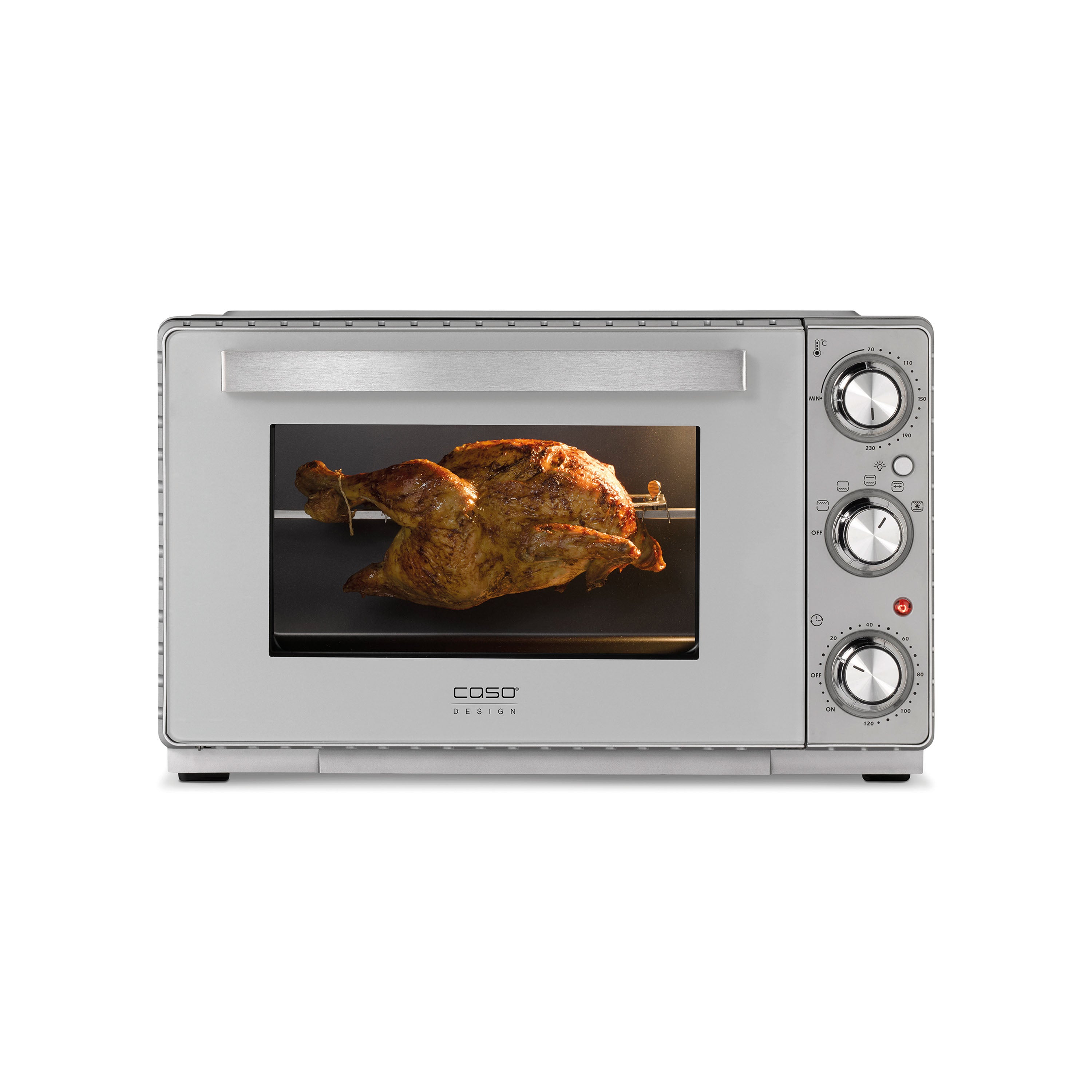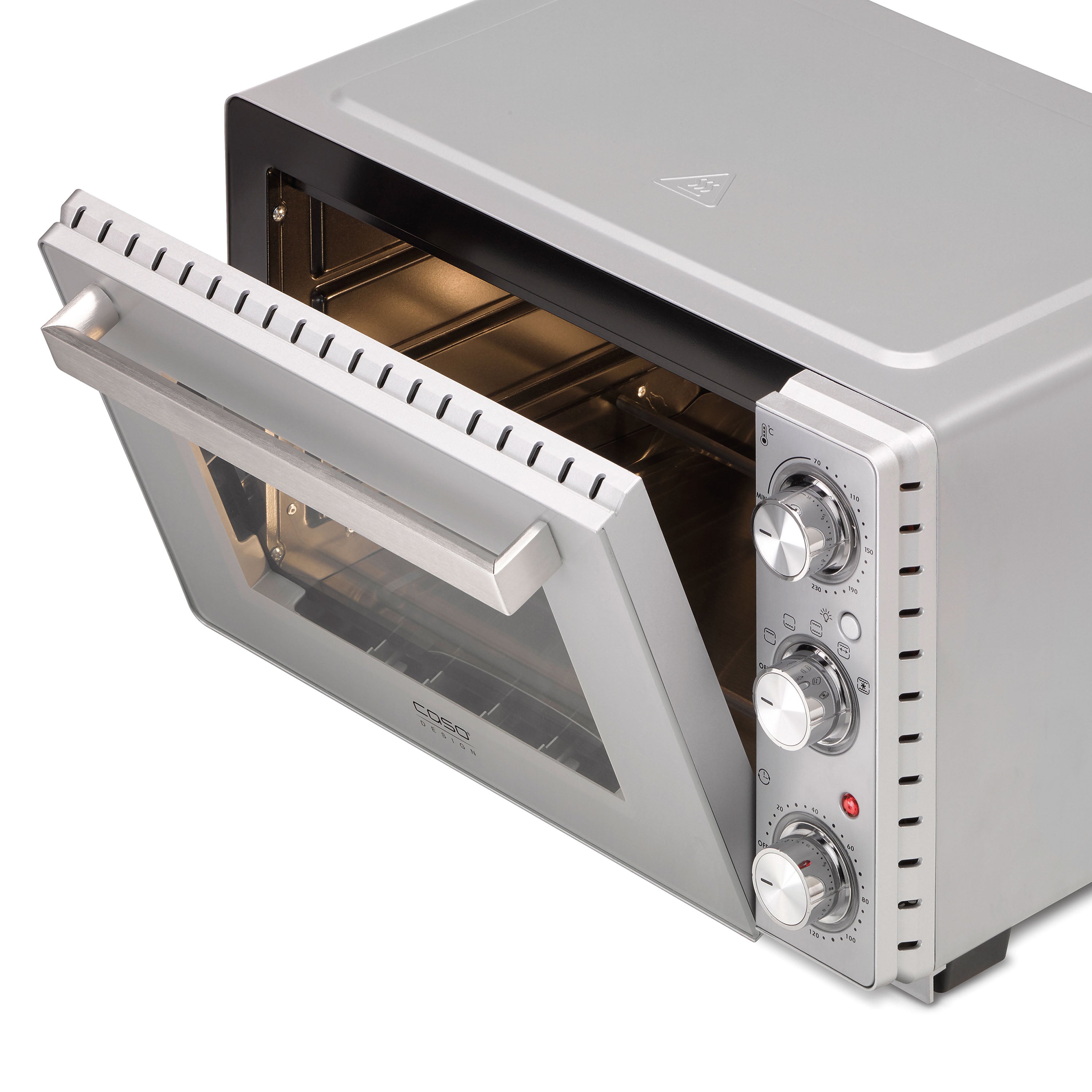 CASO TO 26 SilverStyle è un fornetto elettrico compatto dal design elegante e finitura argento, pensato per la cottura versatile di pane, pizza, arrosti, torte e piatti gratinati. Con una capacità interna di 26 L e 5 funzioni di cottura, offre risultati ottimali grazie alla combinazione di calore superiore e inferiore, convezione, grill e girarrosto con motore. Il timer impostabile fino a 120 minuti e il campo di temperatura da 70 °C a 230 °C rendono il forno semplice e intuitivo da utilizzare. • Forno elettrico compatto da 26 L per cotture quotidiane e specialità gourmet • 5 funzioni di cottura: calore superiore e inferiore, solo superiore, solo inferiore, convezione, grill & girarrosto con motore • Rivestimento interno antiaderente Easy Clean per una pulizia più semplice • Accessori inclusi: pietra per pizza (Ø 30 cm), griglia, girarrosto, teglia antiaderente, cassetto raccoglibriciole e strumenti di rimozione • Timer 30 minuti con segnale acustico • Potenza Grill: 1500 Watt • Capacità: 26 Lt • Dimensioni: 48 x 30 x 40 cm • Peso: 8,7 kg
