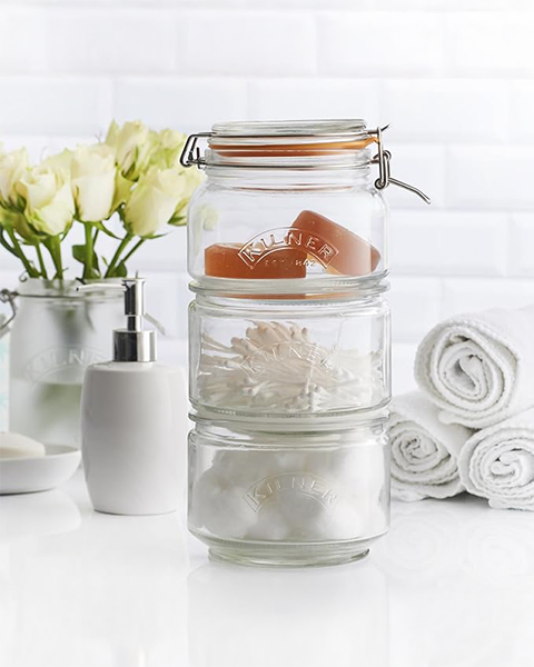 Non solo per la cucina! I barattoli Kilner sono perfetti anche per il bagno, dove possono essere utilizzati per conservare saponi, sali da bagno o piccoli accessori. La loro trasparenza permette di trovare tutto con un solo sguardo, mantenendo ordine e stile.