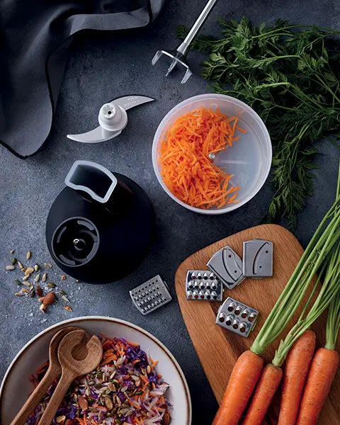 L’elemento che rende questo bundle davvero unico è il SliceSy Nero, un accessorio innovativo che trasforma il Bamix in un robot da cucina multifunzione. Con SliceSy potrai affettare, grattugiare e tritare con estrema facilità, semplificando le preparazioni quotidiane e risparmiando tempo.