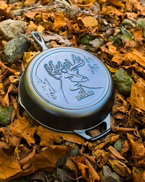 Padella Lodge da 27 cm, perfetta per due persone, con iconico cervo inciso sul fondo.