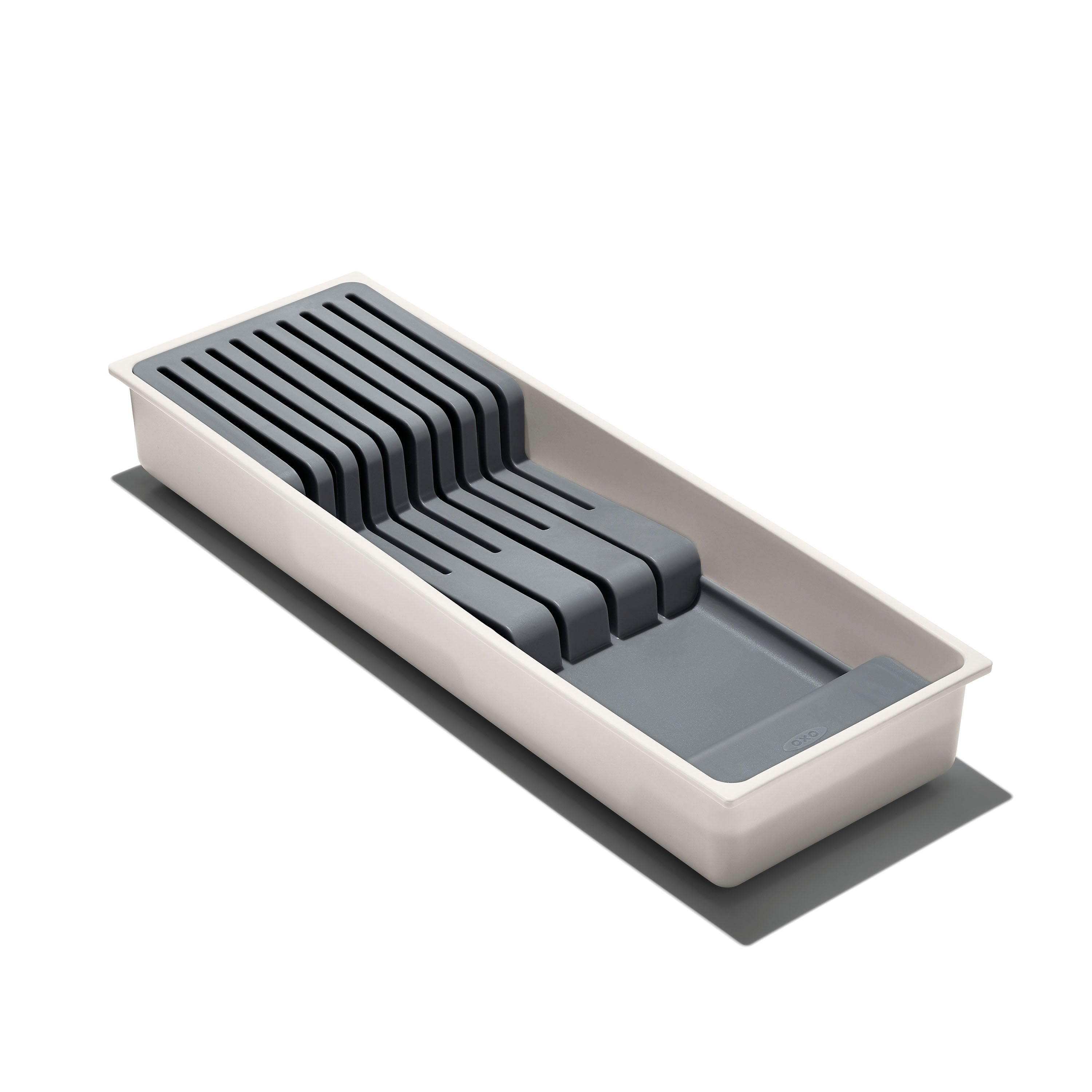 Organizer per coltelli, il modo più sicuro e ordinato per conservare nel cassetto i tuoi coltelli da cucina. Può contenere fino a cinque coltelli piccoli e quattro grandi, protegge le lame facendole durare più a lungo. Conserva in modo sicuro e ordinato i coltelli nel cassetto e risparmia spazio sul piano di lavoro. • Vassoio rimovibile per una pulizia accurata • Piedini antiscivolo mantengono il portautensili in posizione • Dimensioni: 14,1 x 41,2 x 5,9 cm
