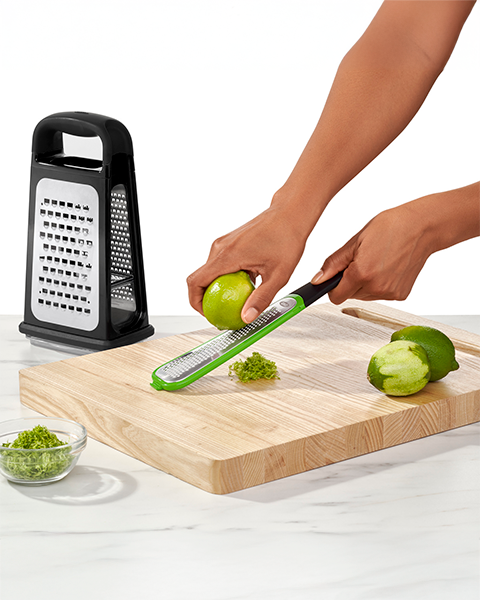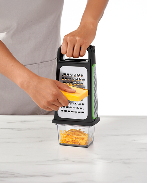 Grazie al contenitore di raccolta integrato, la grattugia OXO permette di catturare e misurare il cibo direttamente mentre lavori. Quando hai finito, il coperchio scatta facilmente sul contenitore, trasformandolo in un pratico strumento per la conservazione.