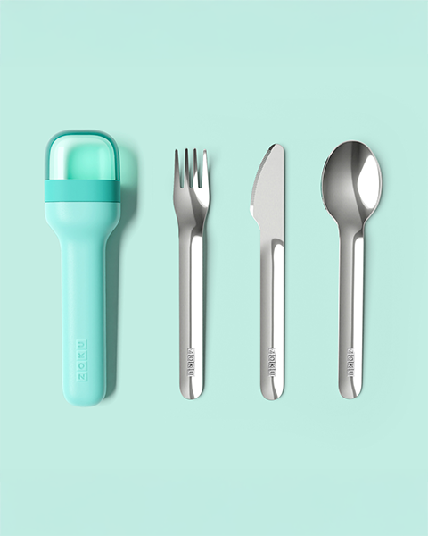 Set di posate in acciaio inox, ideato per sostituire la plastica monouso durante i pr...